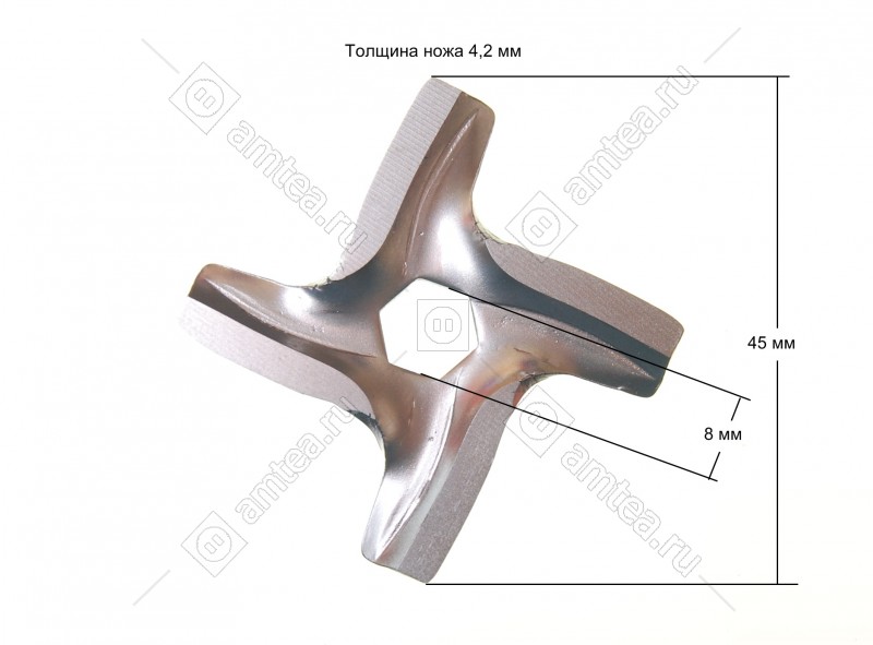 Ширина размаха лопастей 45 мм. Сторона внутреннего отверстия 8 мм. Толщина ножа 4.2 мм. Внутреннее отверстие - шестигранник. Подходит к моделям Moulinex HV3 (A14, A15 - выпуска после 01.01.2000 г.; DRA, DRB), HV6 (DR7, DR8, GVM2), HV8 (DKA1, DKA2), Redmond RMG (1211, 1212, 1212-7-Е, 1223, 1224, 1229, 1231, 1234)