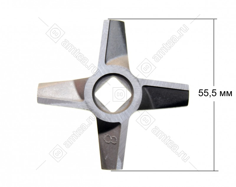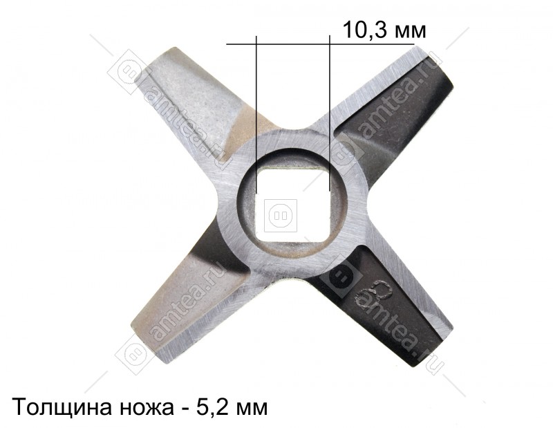 Ширина размаха лопастей 55.5 мм. Сторона внутреннего отверстия 10.3 мм. Толщина ножа 5.2 мм.