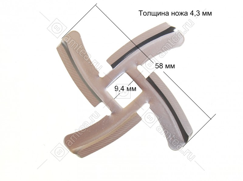 Ширина размаха лопастей 58 мм. Сторона внутреннего отверстия 9.4 мм. Толщина ножа 4.3 мм.